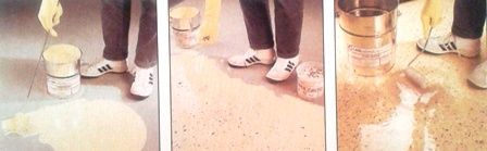 Aby wyeliminować wpływ nieszczelności starego podłoża spróbujmy uszczelnić warstwę posadzki. Do jej uszczelniania stosuje się płynne tworzywo sztuczne. Mowa tu o powłoce, która likwiduje wszelkie nieszczelności. Dzięki temu pozostawimy starą posadzkę i nie musimy pracowicie wydłubywać fug oraz na nowo ich wypełniać. Jest to również okazja, aby nawierzchni nadać nowy estetyczny wygląd. Można w ten sposób niezbyt atrakcyjne posadzki gruntownie zmienić np. szarą gładź cementową pokrywamy powłoką z zatopionymi barwnymi ziarnami kwarcu lub strużynami tworzywa, zabezpieczającymi przed poślizgiem. Te metodę stosujemy również do renowacji schodów. Na ilustracjach pokazano nakładanie płynnego tworzywa sztucznego z dodatkami na posadzkę cementową. Zestaw firmowy Coestrans składa się z podkładu, barwnych strużyn i przeźroczystej powłoki zewnętrznej, odpornej na promienie UV. Po dokładnym oczyszczeniu i osuszeniu podkładu rozprowadzamy farbę podkładową w jednym z trzech podstawowych kolorów (szarym, bezowym, zielonym). Na jeszcze wilgotną warstwę rozrzuca się równomiernie, ale niezbyt gęsto barwne strużyny tworzywa sztucznego. Po wyschnięciu nakładamy wierzchnią warstwę ochronną. Przezroczystą masę rozprowadzamy wałkiem na całej powierzchni. Przy nakładaniu powłoki na posadzkę z płytek stosuje się dodatkowo warstwę gruntującą, poprawiająca przyczepność.